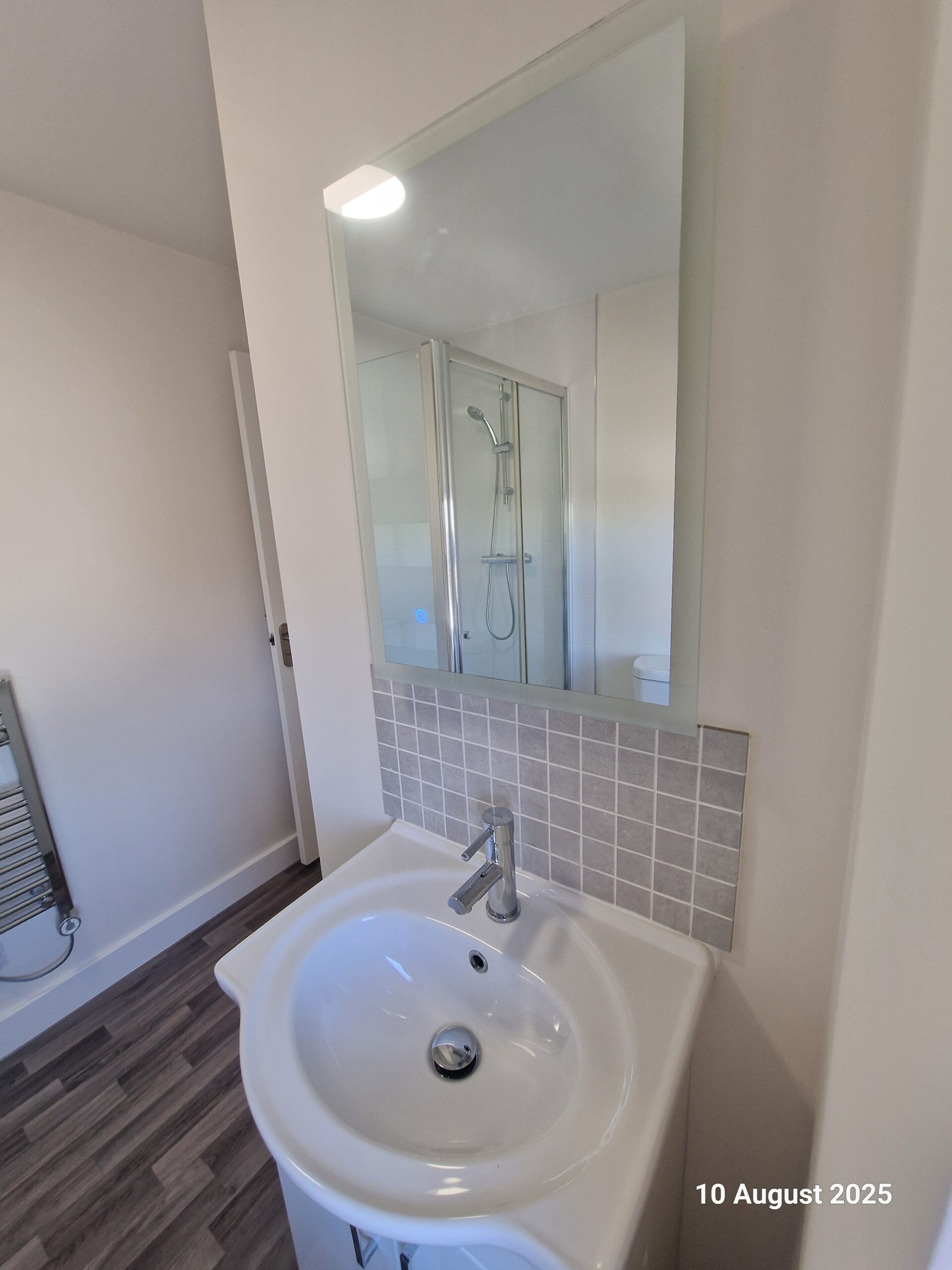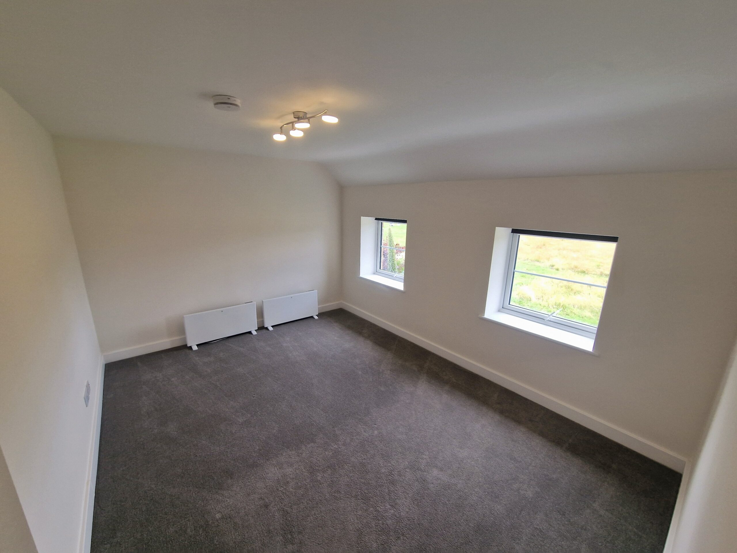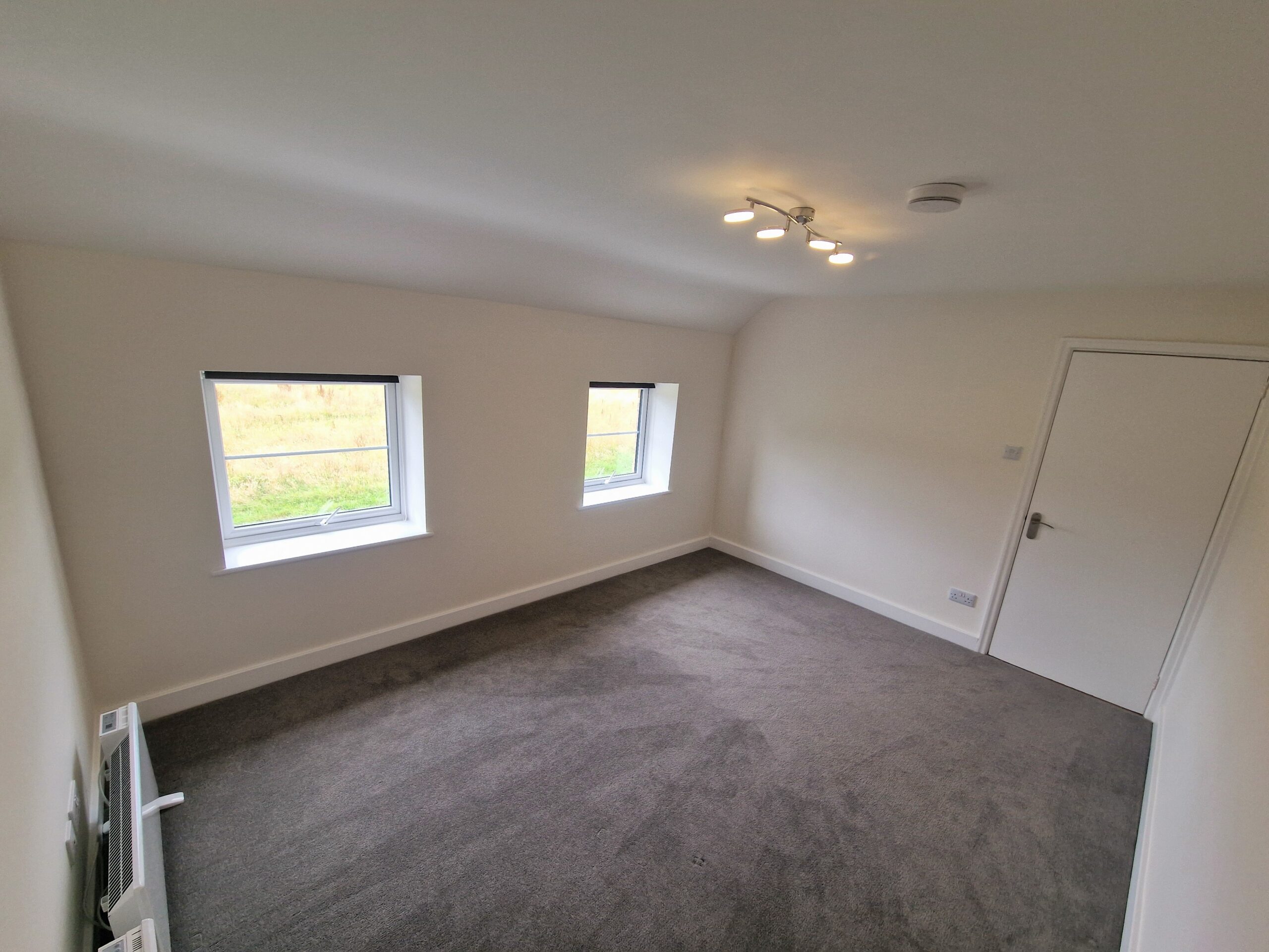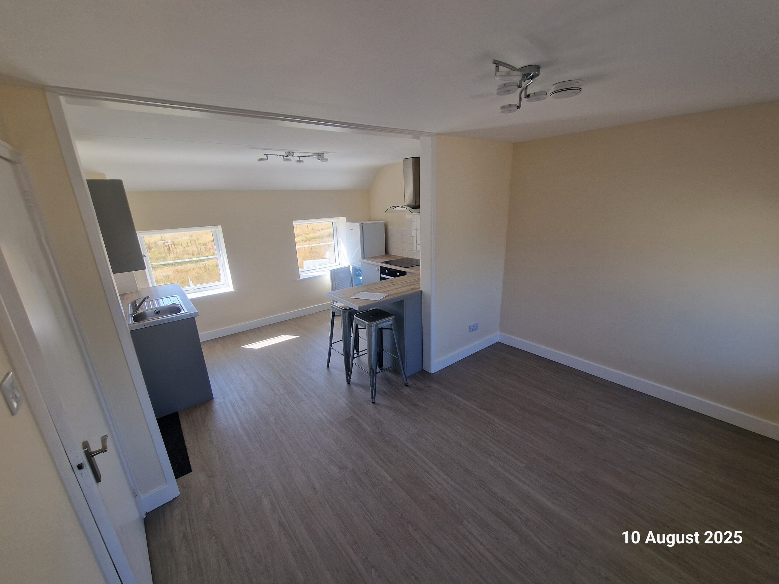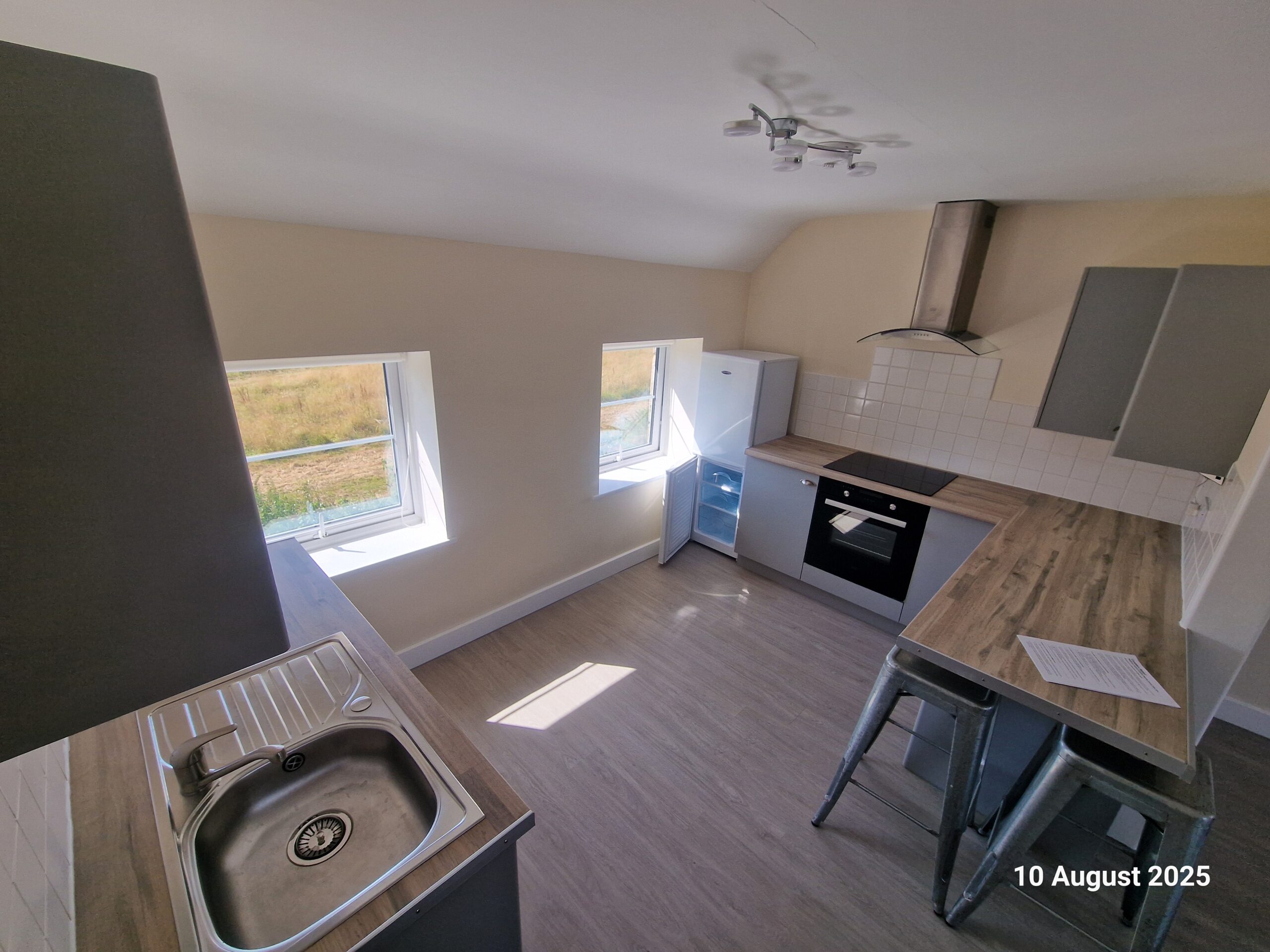 This first floor flat in a country location has own entrance hallway, open plan kitchen lounge ,double bedroom and shower room toilet
